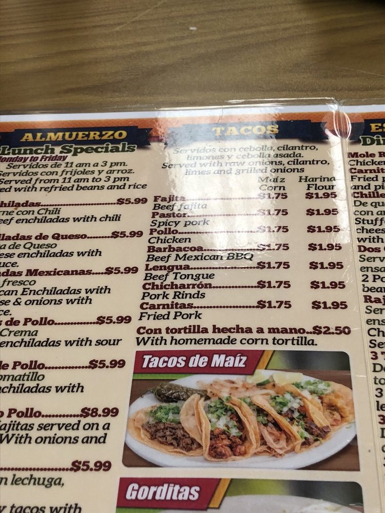 De fajita, pastor, pollo o barbacoa. Two tacos. Beef, pork, chicken or barbacoa.